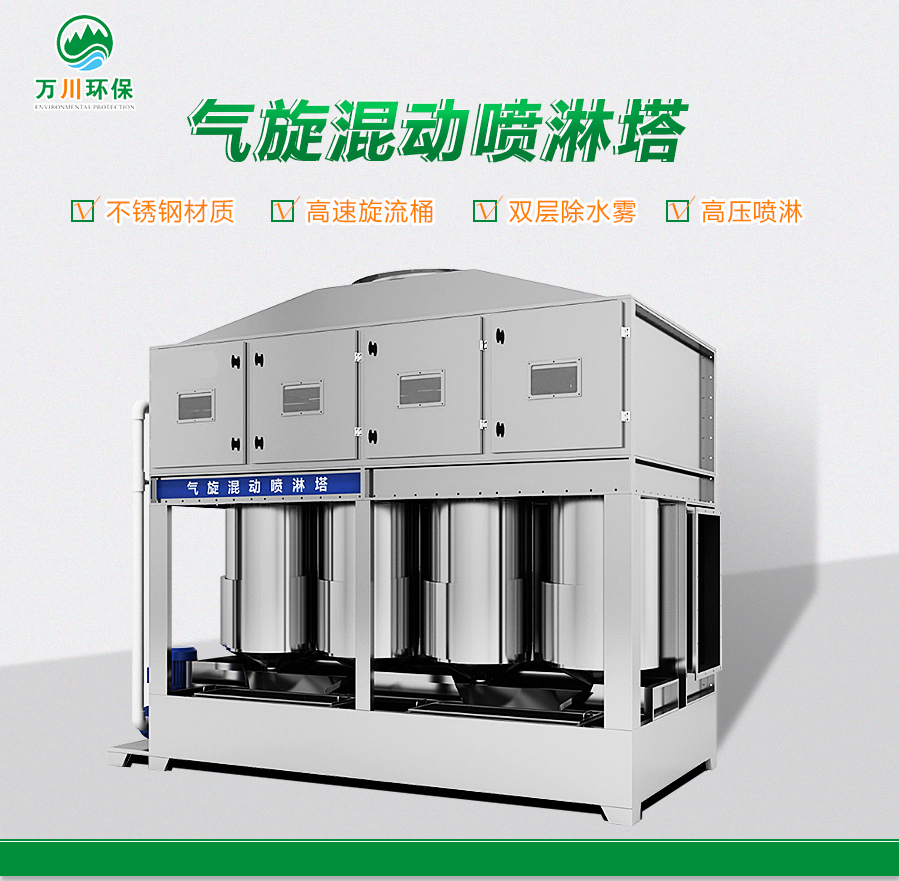 雙級氣旋噴淋塔利用氣體與液體之間的接觸進行氣液分離。氣體中的污染物傳送到液體中,與液體充分接觸洗滌,它能有效分離氣體中含塵含味物質(zhì),降低氣體溫度,凈化污染氣體,達到清凈空氣的目的。