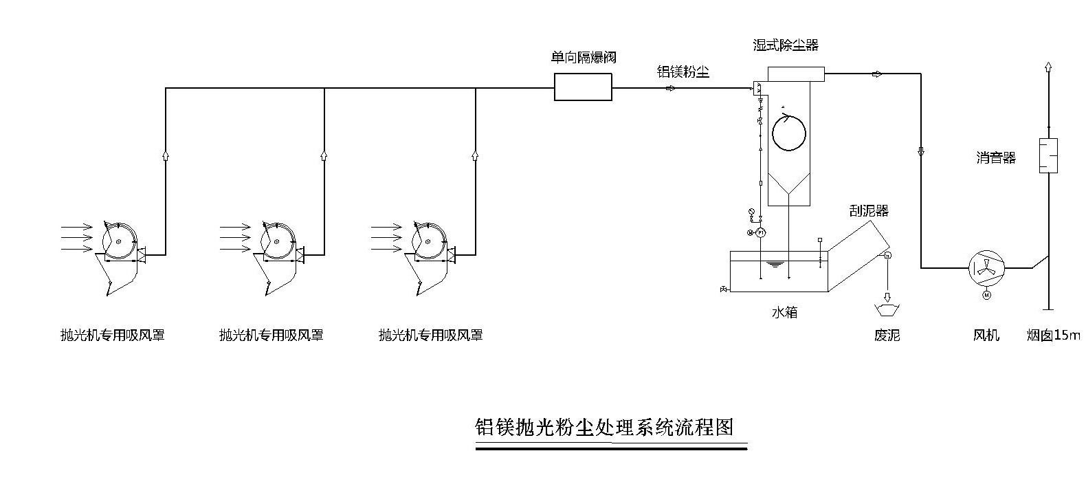 在原有的拋光機(jī)上設(shè)計(jì)專用的吸風(fēng)罩,吸風(fēng)罩有效捕集鋁鎂粉塵收集效率達(dá)到95%以上,粉塵通過(guò)管道輸送到濕式除塵器,再經(jīng)過(guò)濕式除塵器,粉塵顆粒物與水充分接觸,去除其中大部分顆粒污染物,去除效率高于95%,處理后的氣體可以通過(guò)室外煙囪直接排放到大氣中。