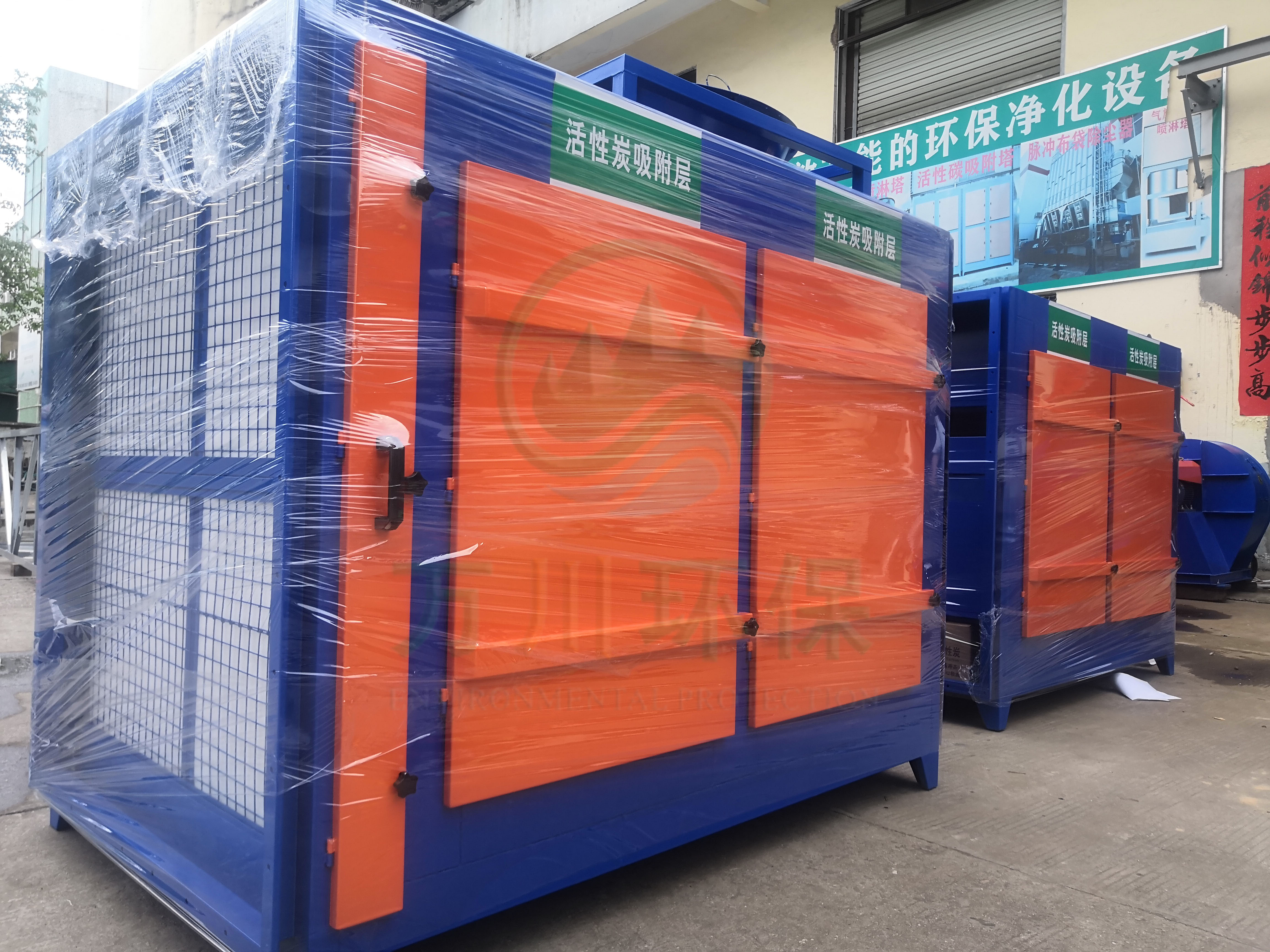 根據(jù)廢氣類型和場地需求我們采用兩級活性炭吸附法對其進行處理。配套兩臺1萬風量的碳鋼材質(zhì)活性炭吸附塔與大功率離心風機,自帶自動化控制系統(tǒng)。