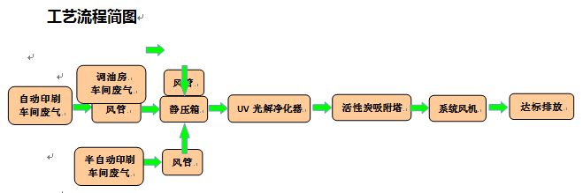 因為該企業(yè)印刷機車間均為密閉車間,且已做排風系統(tǒng),但排風系統(tǒng)和小風機均為直排到高空和廠房1樓外部,影響到了周圍環(huán)境。經(jīng)過我司工程師現(xiàn)場勘查,結(jié)合企業(yè)的實際生產(chǎn)情況,我們最終決定采用UV光解法+活性炭吸附法來進行處理。