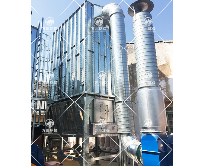 木屑吸入至風管,以負壓的形式進入到脈沖布袋除塵器。含塵廢氣進入中箱體下部,在擋風板形成預分離室內,粉塵因慣性作用落入灰斗。