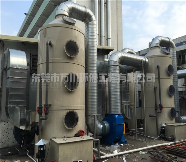 根據(jù)氨氣具有易溶于水的特點,氨氣可以使用噴淋塔處理。氨氣廢氣從風(fēng)管進入噴淋塔,經(jīng)過噴淋層,噴淋頭不斷的向下噴水,由下到上不間斷地噴水,氨氣的濃度越來越低,最后達標(biāo)排放,收集起來的氨水還可以重新利用。