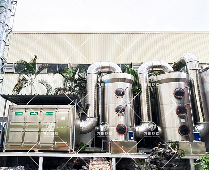 根據(jù)客戶需求和我司實(shí)地考察之后,最終采用‘兩級(jí)噴淋吸收法+活性炭吸附法’對(duì)其進(jìn)行處理。采用水噴淋一方面可以降溫,另一位方面能夠讓水吸收一部分的有機(jī)廢氣,降低后續(xù)活性炭吸附的負(fù)荷。